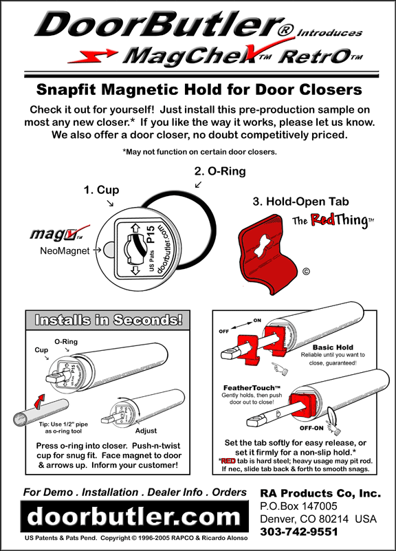 US Pats & Pats Pend.: US.D395,995; US.D425,776; US.D425,399; US.5,829,098; US.5,953,789; US.6,032,331; US.6,397,431; US.6,640,387 . Door Butler®, Door Genie™, The Red Thing™, The Jimmy Clip™, Charlie™, MagChek™, Basics™, Premier™, Ultra™, Century™, Touch-O-Feather™, The Bead Goes On™, TriLoc™and the reddish colored hold-open tab are trademarks of R.A. Products Co. Inc. Copyright © 1996-2004 RAPCO™ & Ricardo Alonso. Website by RAPCO. |