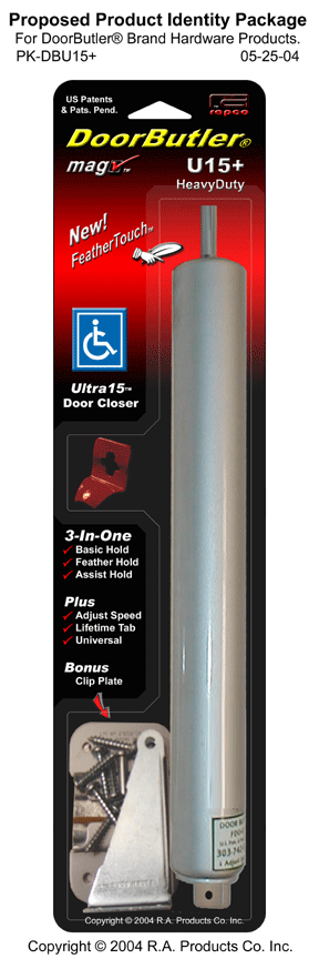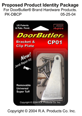 US Pats & Pats Pend.: US.D395,995; US.D425,776; US.D425,399; US.5,829,098; US.5,953,789; US.6,032,331; US.6,397,431; US.6,640,387 . Door Butler®, Door Genie™, The Red Thing™, The Jimmy Clip™, Charlie™, MagChek™, Premier™, Ultra™, Century™, Touch-O-Feather™, The Bead Goes On™, and the reddish colored hold-open tab are trademarks of R.A. Products Co. Inc. Copyright © 1996-2004 RAPCO™ & Ricardo Alonso. Website by RAPCO. |